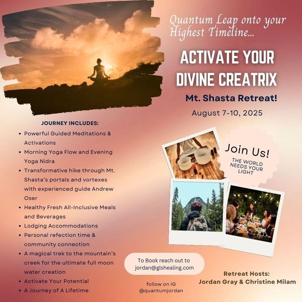 This Summer during the Lion's Gate Portal we will be taking a journey to the root chakra of Mt. Shasta. For 4 days and 3 nights, you will have the opportunity to commune with your soul and receive the wisdom of the ancient mountain. Included in this retreat are morning yoga classes, evening yoga nidra and sound baths, accomodations, a 5 hour hiking expedition led by experienced guide Andrew Oser, a dinner out in town, all inclusive food and non alcoholic beverages, a magical trek to the waters of Shasta to collect and create your very own moon water spray, and powerful guided meditations and activations led by Jordan Gray. This is an experience of a lifetime and the intention of this retreat is to give you space to unwind and get back in touch with your soul and your divinity. We currently have 3 spots left. Please email jordan@portalfolighthealing.com for more info.
